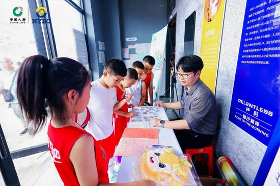 比赛当日,中国人寿寿险吉祥物“牛犇犇”成为赛场焦点——它不仅与小球员们进行投篮热身互动,还在球员通道为每一位登场选手加油助威。在馆内专属展区,公司通过品牌文化墙展示公司企业文化精神,工作人员向家长及小球员发放磁吸贴、笔记本、颈枕等吉祥物周边物料超200份,将保险保障理念以年轻化方式传递。